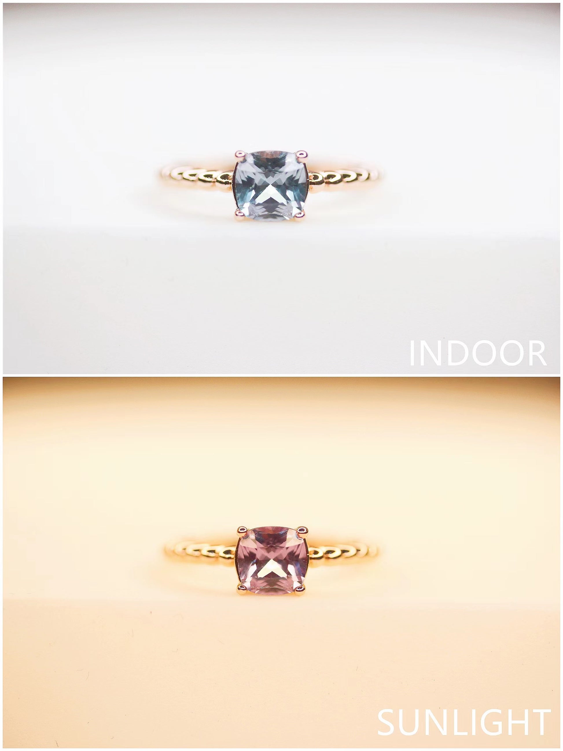Alexandrite's awe-inspring colors change from shades of green and blue to vivid reds and purples as it moves from indoor light to sunlight. Every stone is unique, hence the color change will varies.
