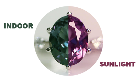 Alexandrite's awe-inspring colors change from shades of green and blue to vivid reds and purples as it moves from indoor light to sunlight. Every stone is unique, hence the color change will varies.